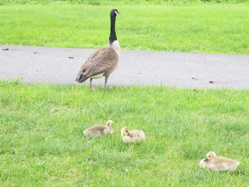 4 June 2014: FDU, in the late afternoon: Goose families start to eat and poop all over a large field