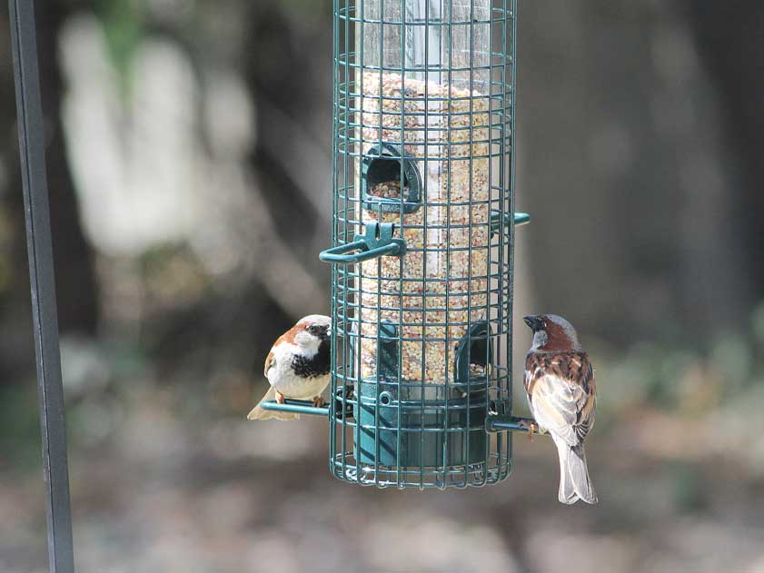 House sparrows started exploring the new feeders. They preferred the one closest to the garage, which had an "open"