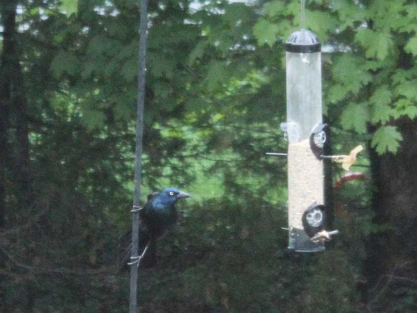 Friday, 9 May 2014. A big variety of birds tried the feeders. Here's a grackle inspecting the small feeder.