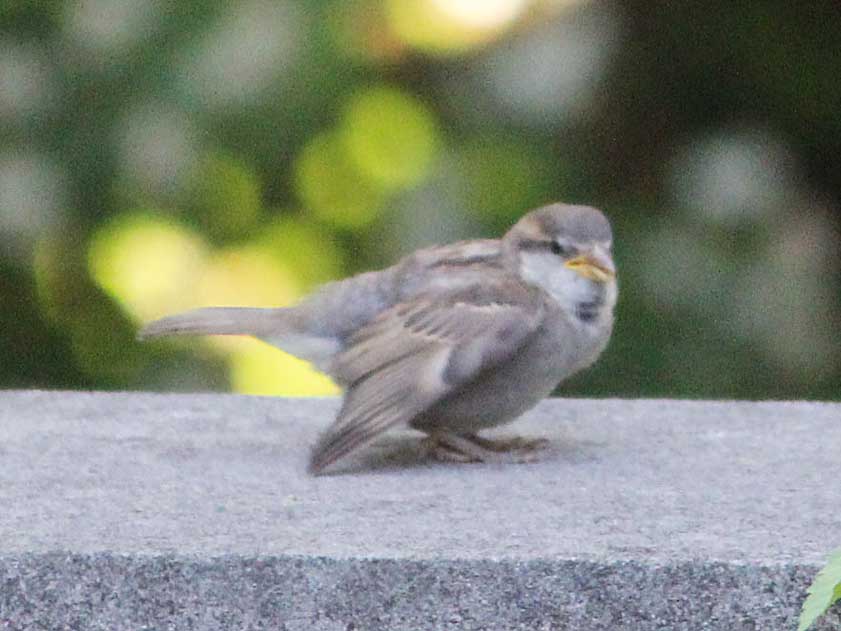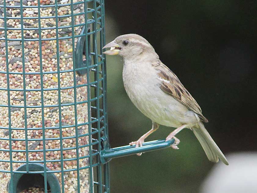 Much fatter, and with no stripes on its belly: A female house sparrow. Munch, munch, munch, all day.