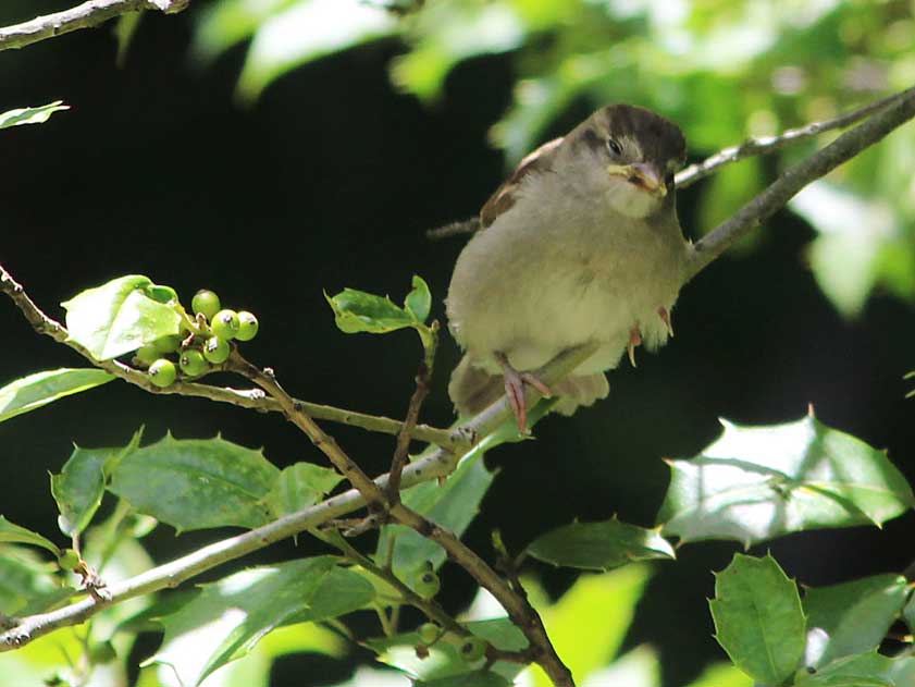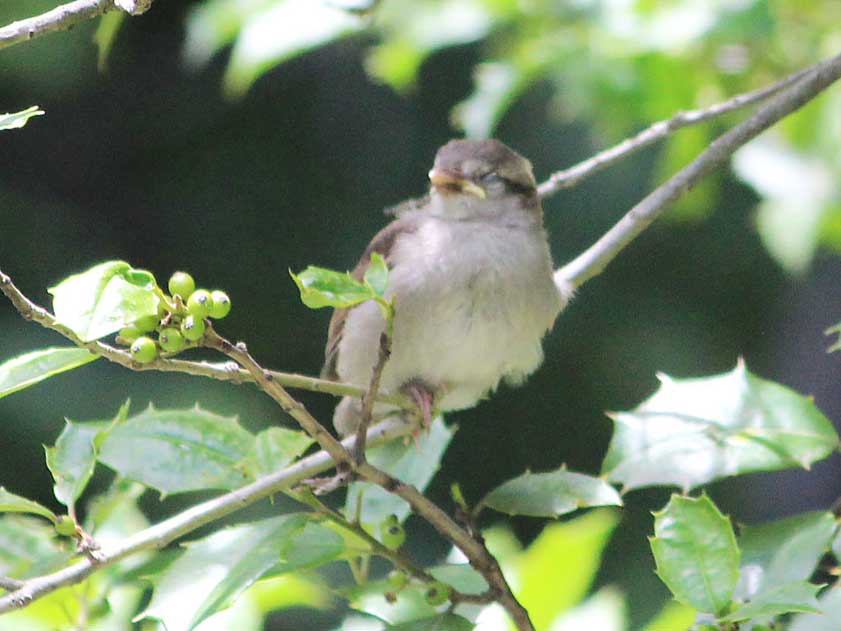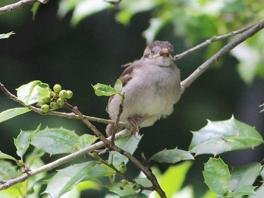 21 June 2014. A baby house sparrow is spotted in the holly tree, looking a little sleepy.
