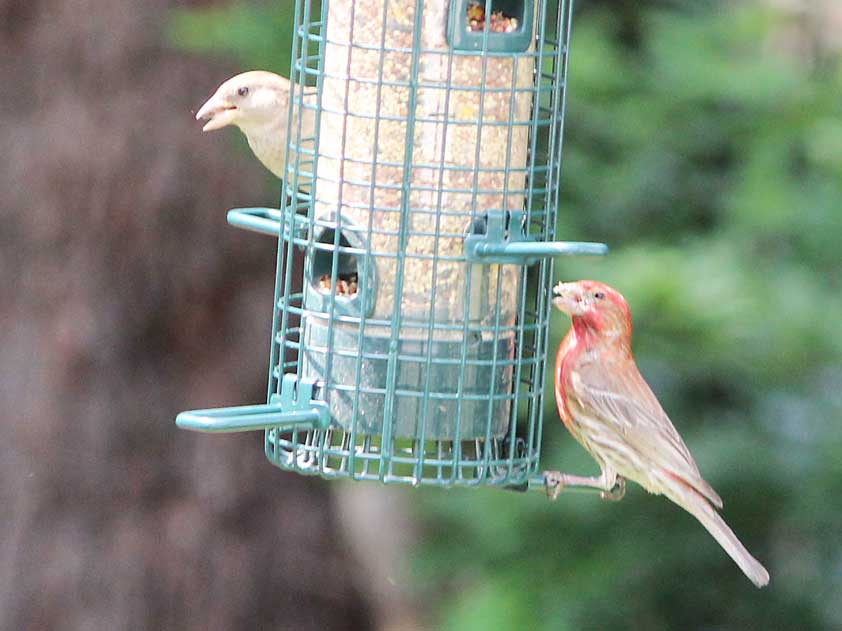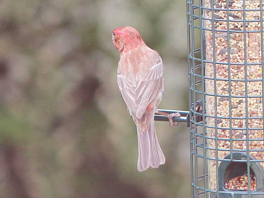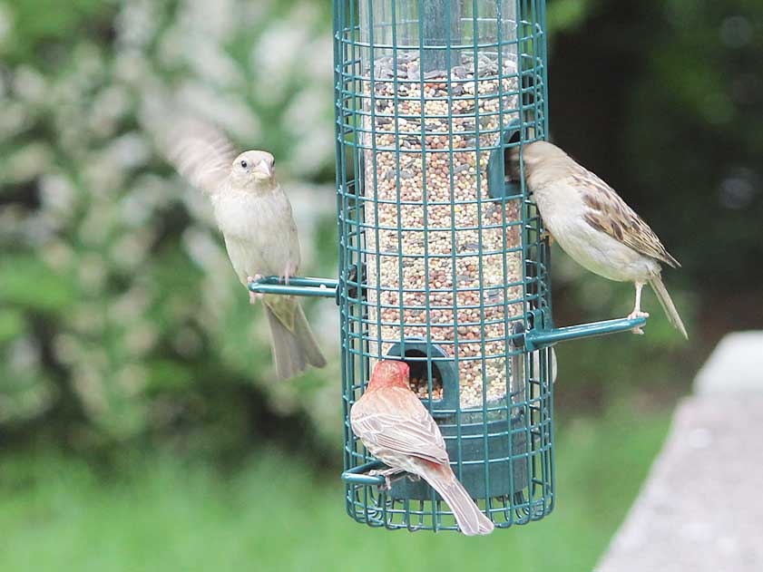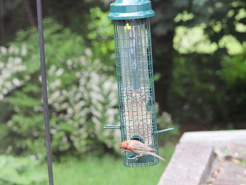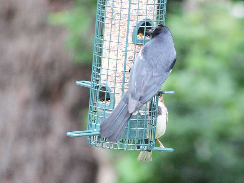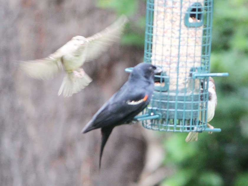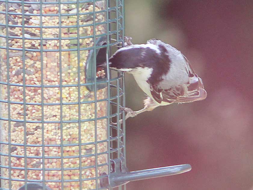 Unlike the house sparrows, the chickadee extracts one seed and then flies away. Then he comes back a few minutes