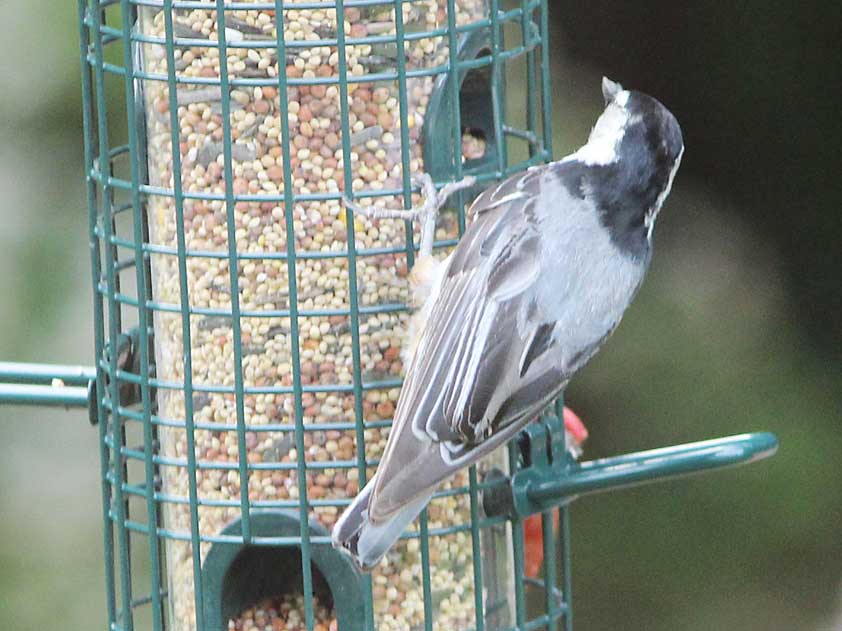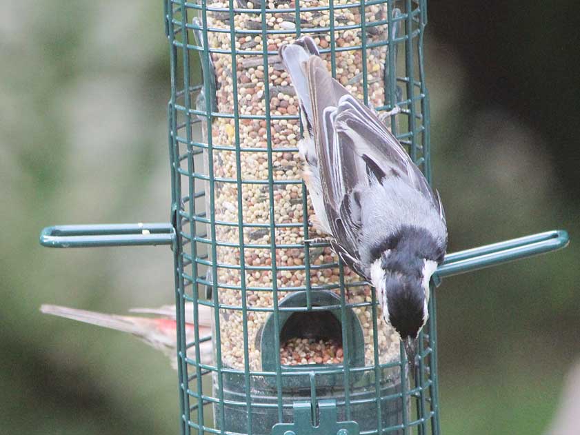 A black-capped chickadee appears over two days. He usually feeds upside down.