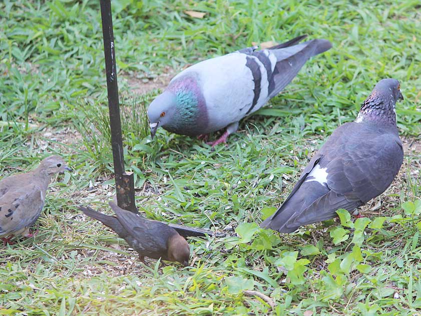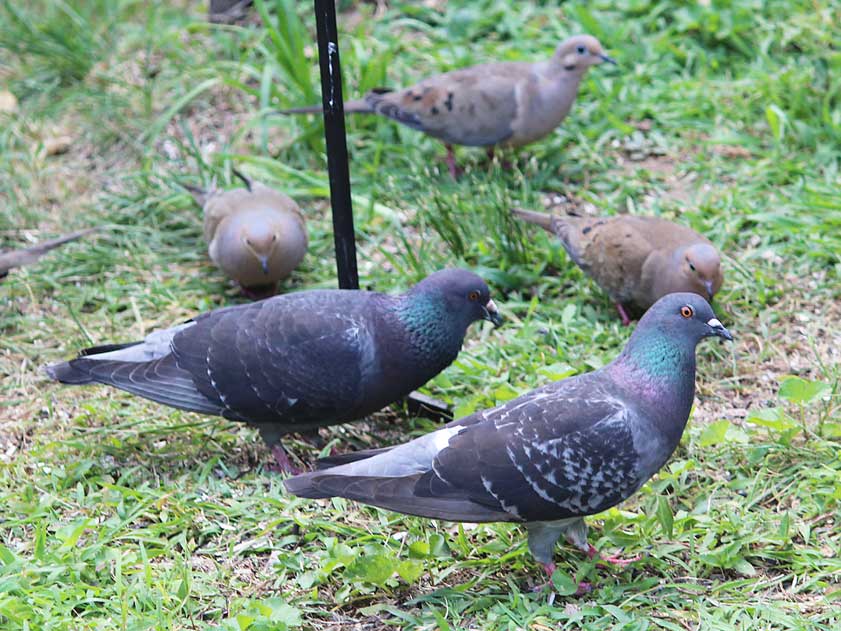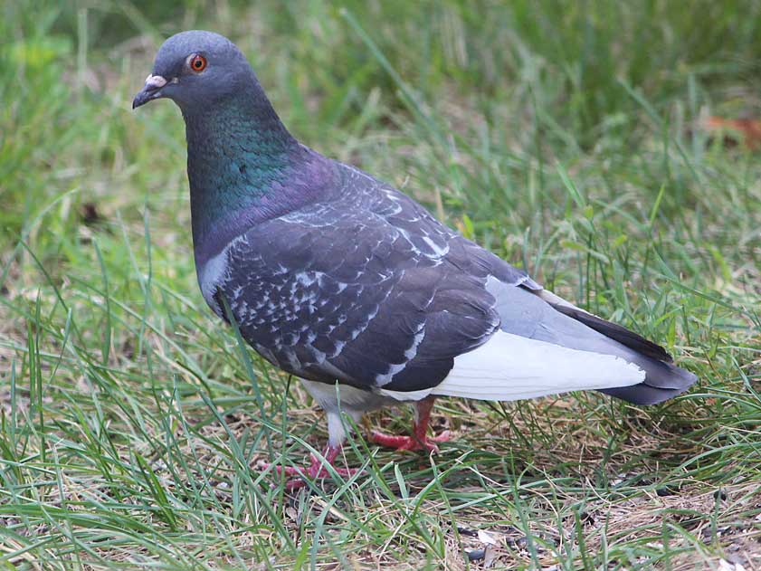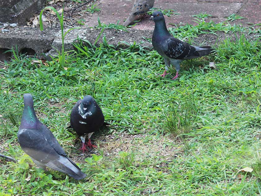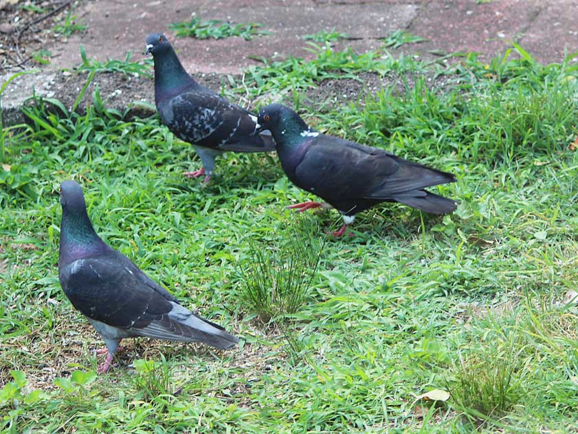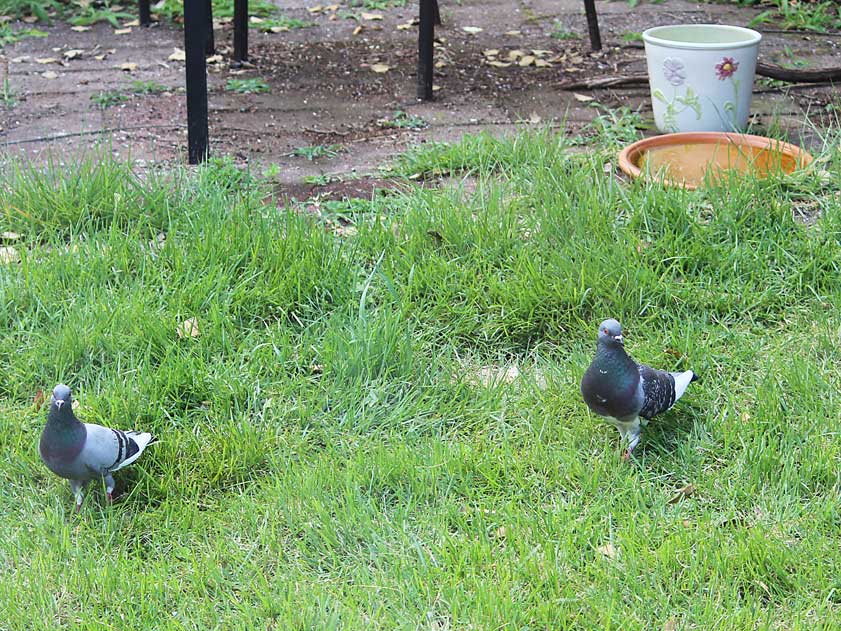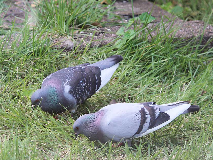 Monday, 30 June 2014. One rock dove couple share a different feature: a long brilliant white part of the wing.