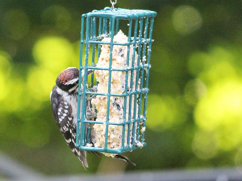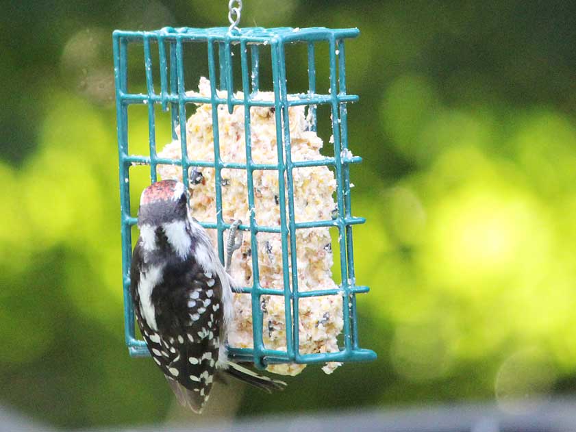 a small downy woodpecker tried it out. The next day, 1 July, it came back.