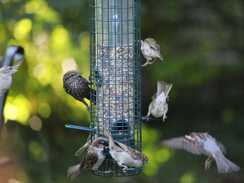 5 July 2014. Trying "halos" around two of the three feeders, to see if they allow other birds to eat, without