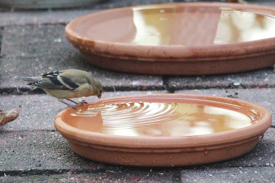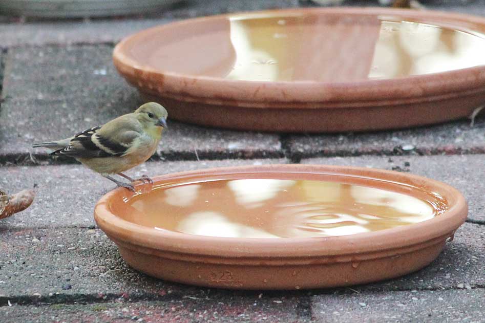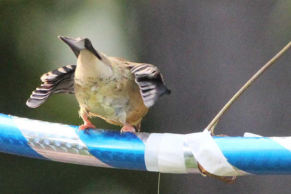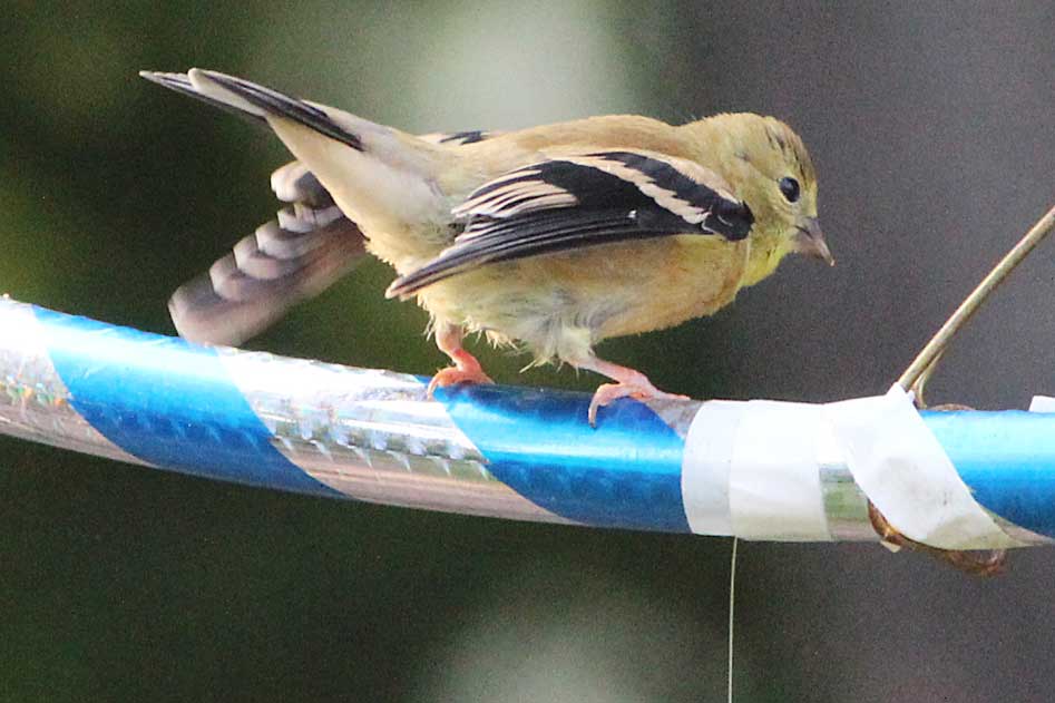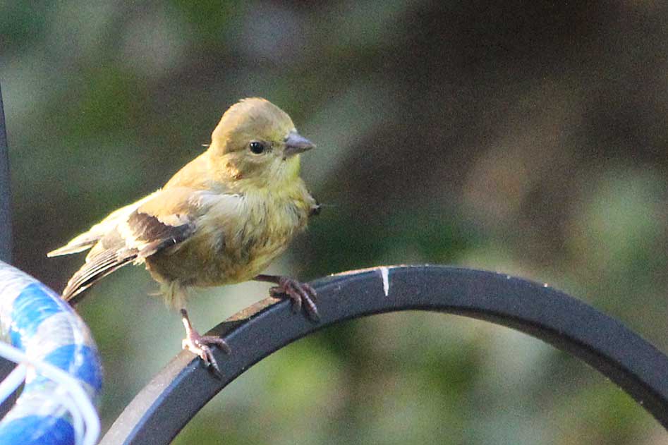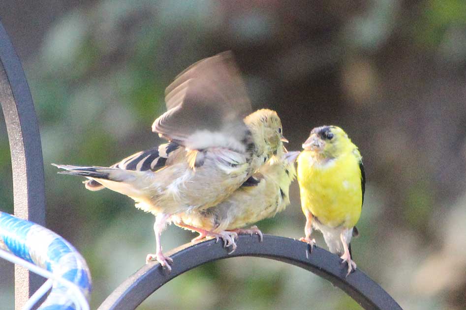 And then, in a startling turn of events, the other juvenile goldfinch flies between the hungry juvenile and its father.