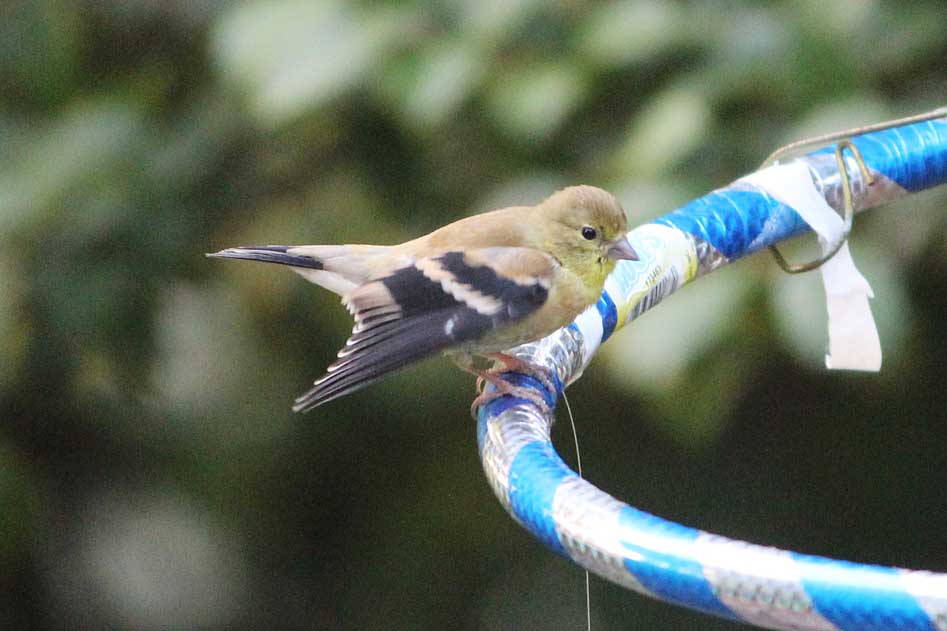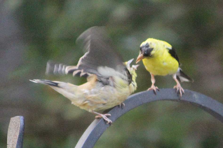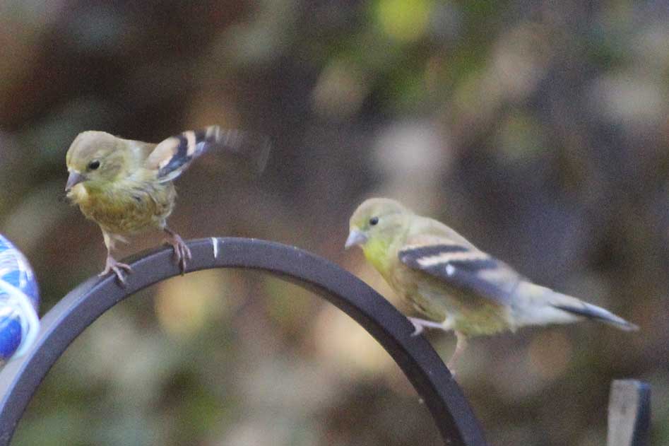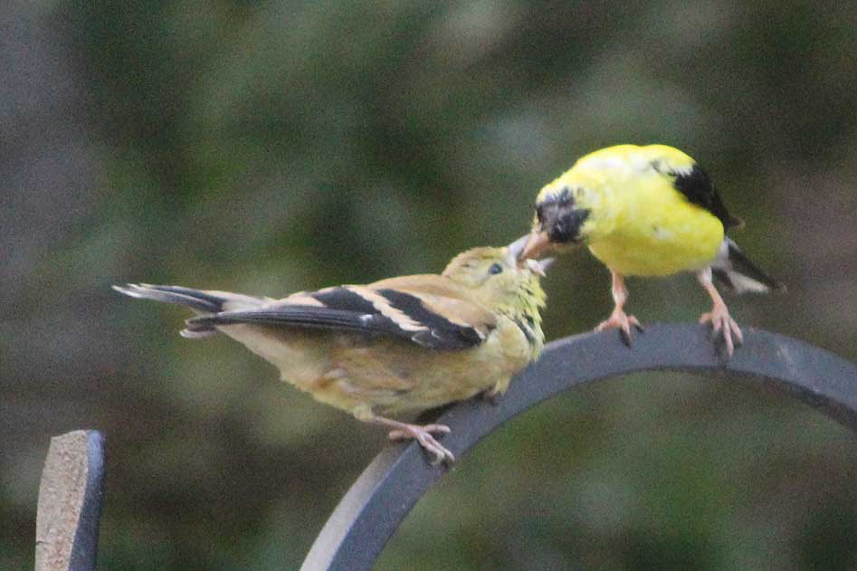 The juvenile goldfinches wait for more food from papa goldfinch. The one juvenile can sustain its begging calls and wing flapping