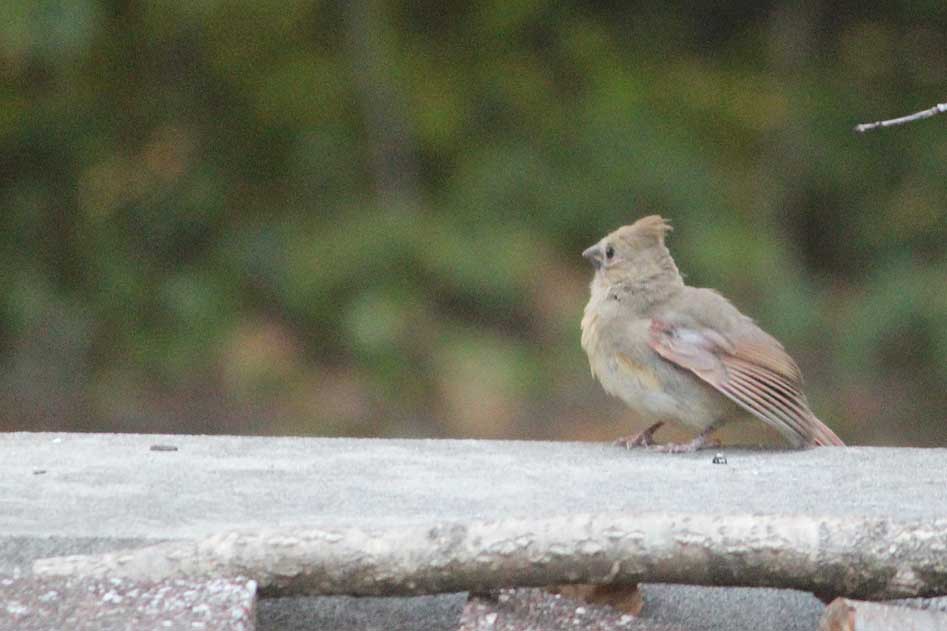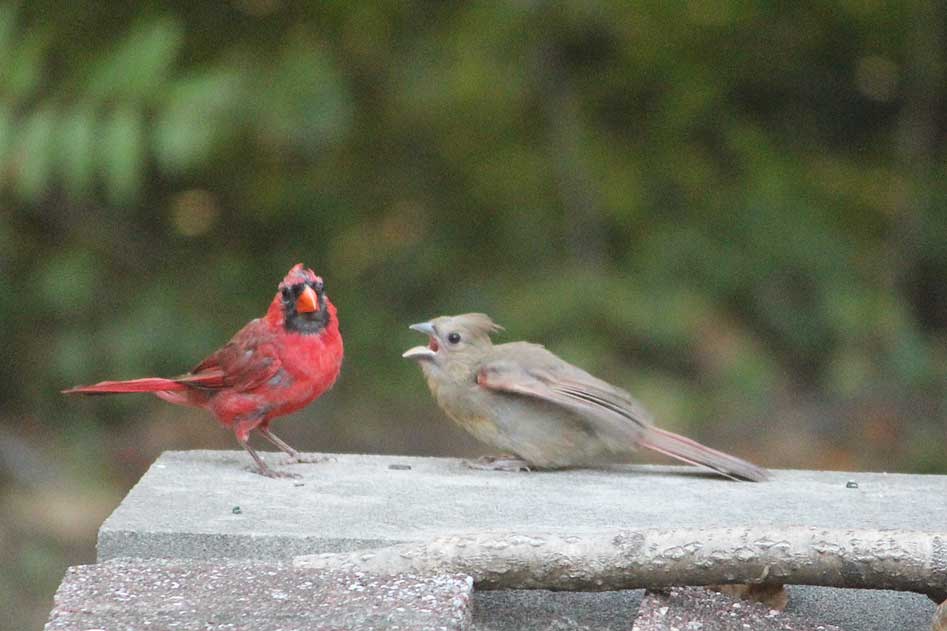 A juvenile cardinal squawks impatiently. I am surprised by how many baby / juvenile birds have appeared in September, begging to be