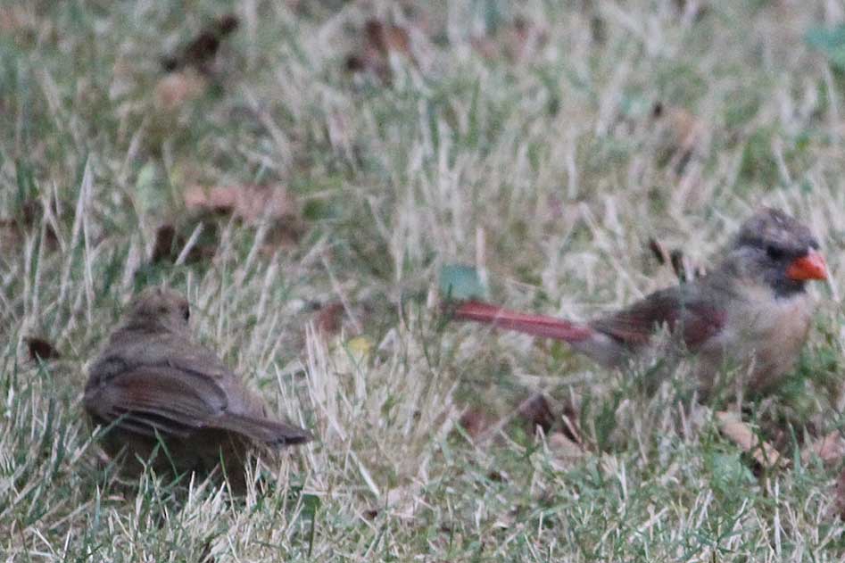 Mother Northern cardinal (orange beak) and offspring (grey beak).