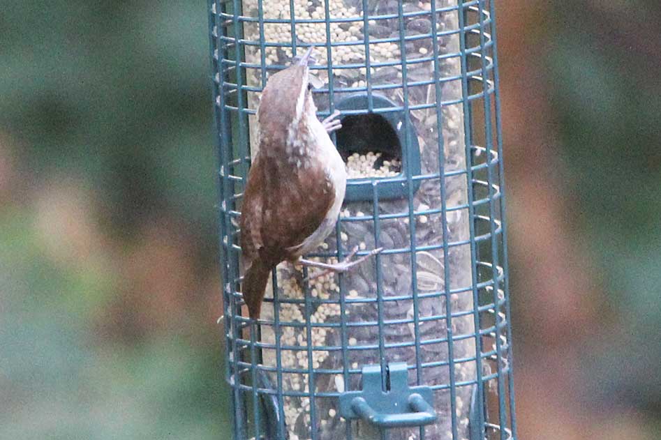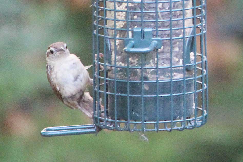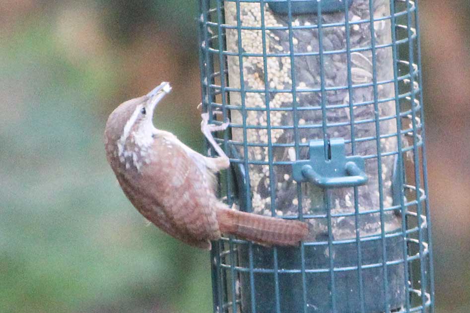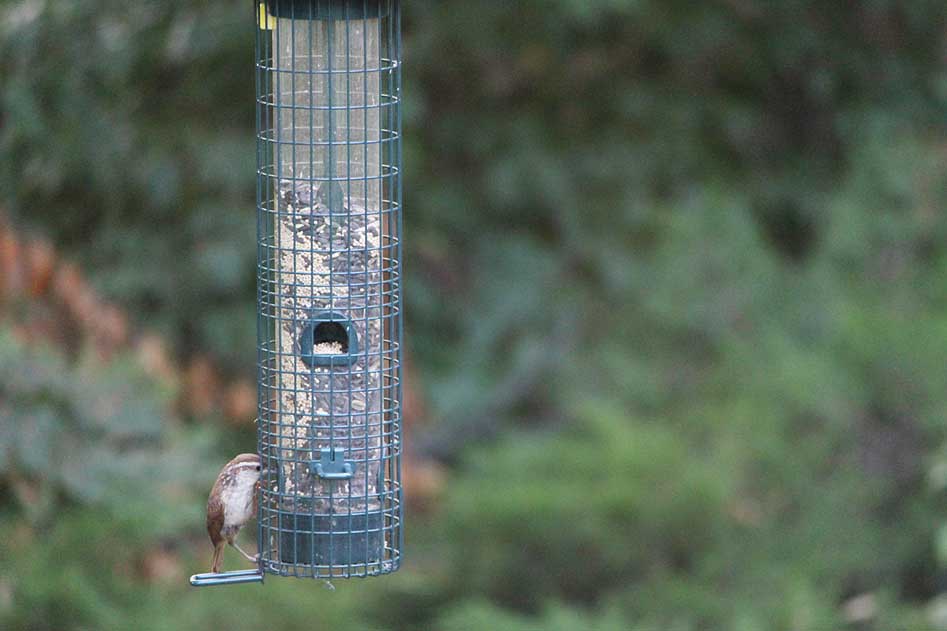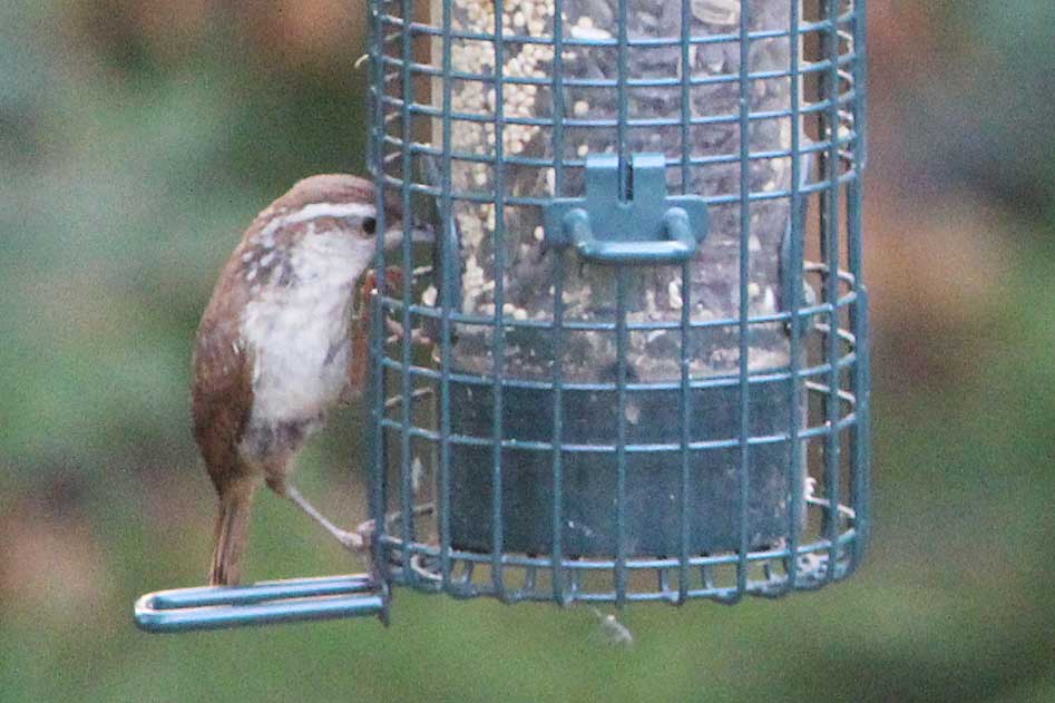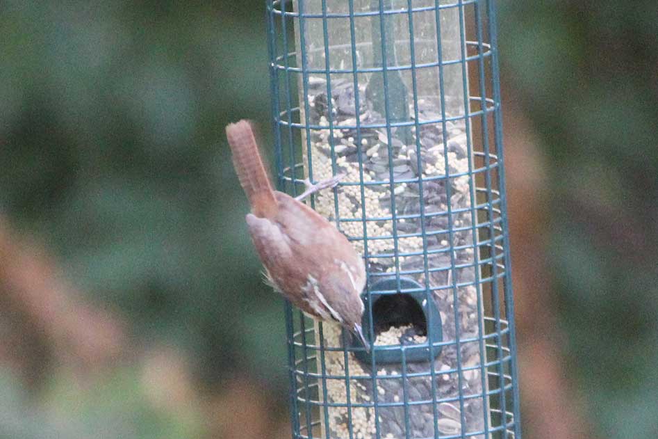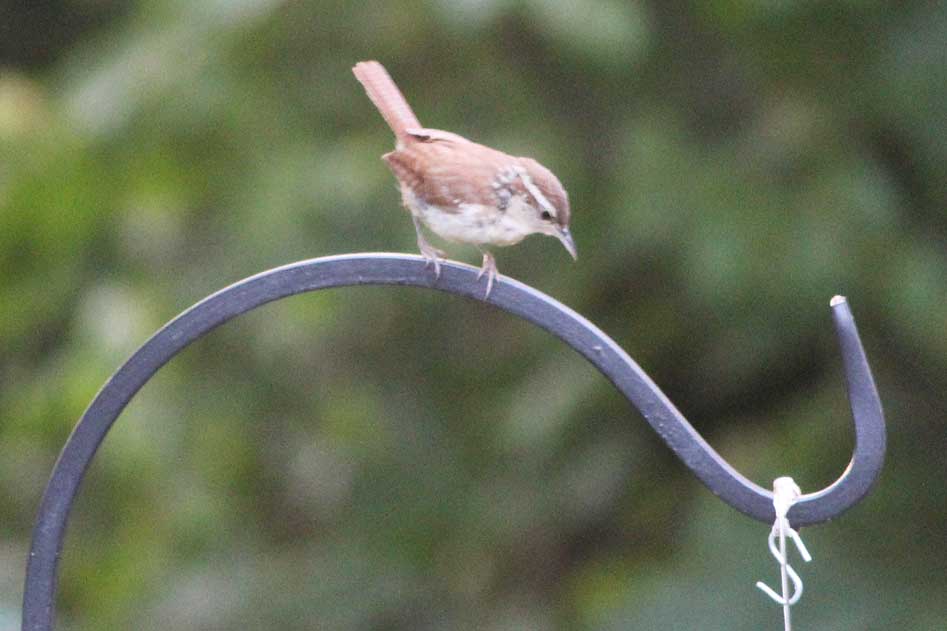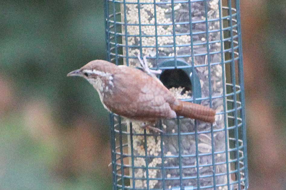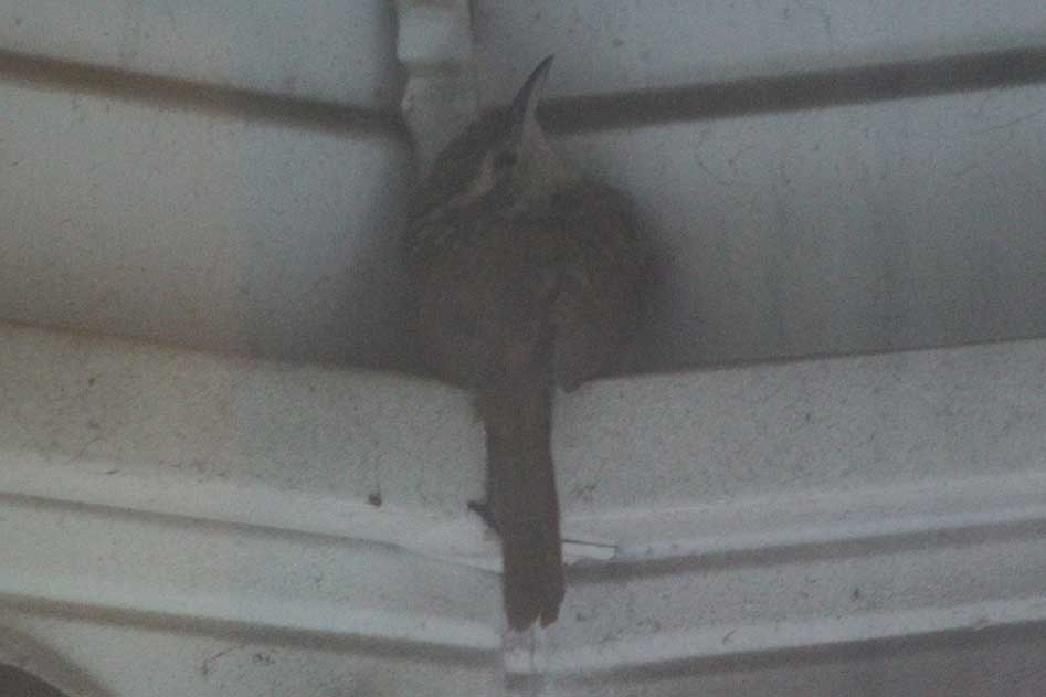 As the light fades (around 7 p.m.), a lone Carolina wren spots a corner under a metal awning, and flies up into the corner, under the awning.