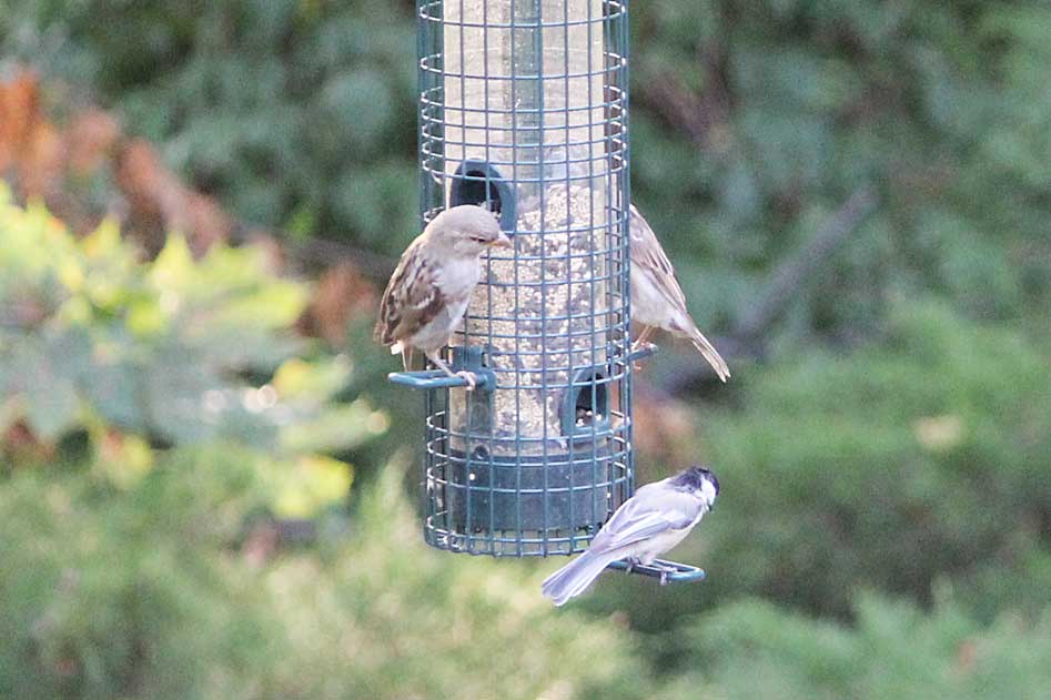 And back on the house sparrow feeder, the black-capped chickadee finds an opening, and darts in.