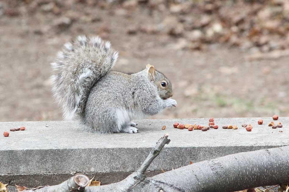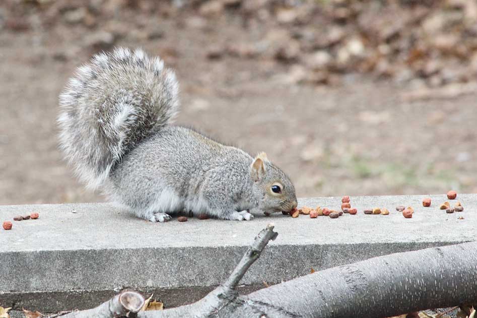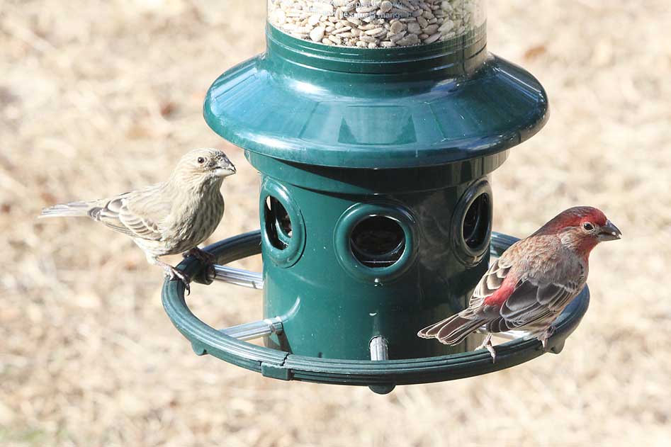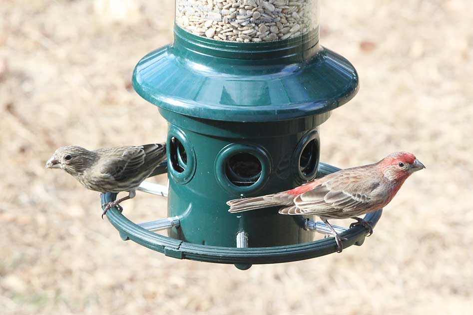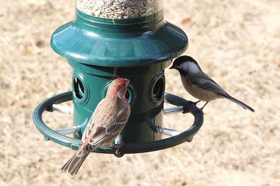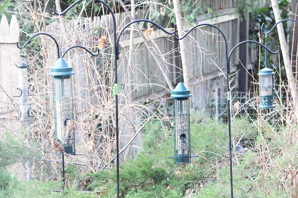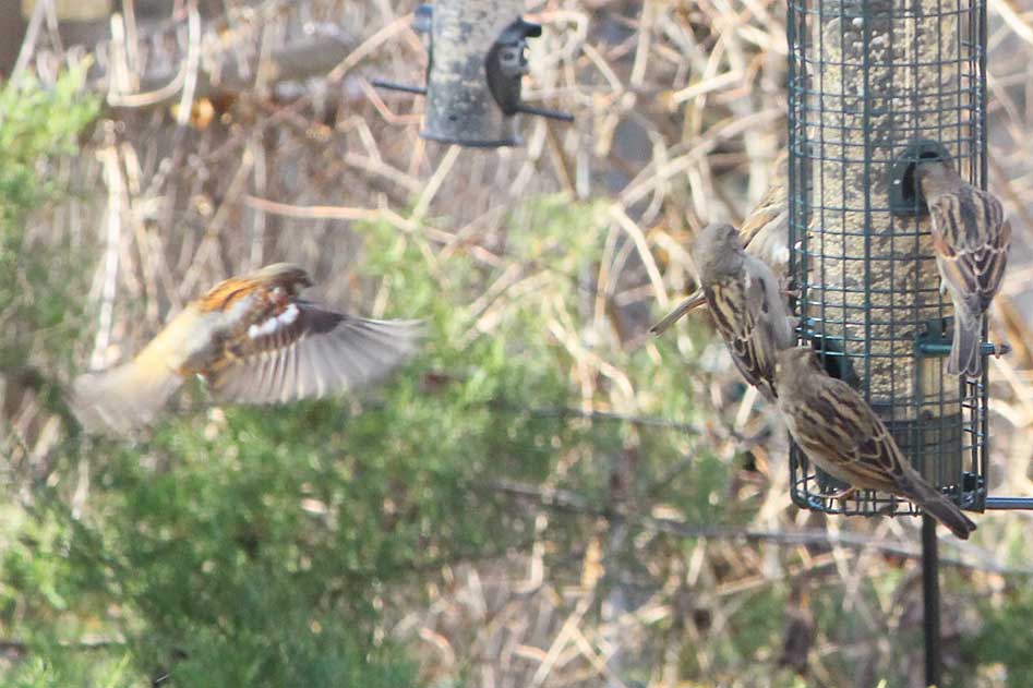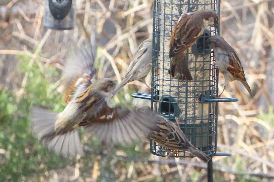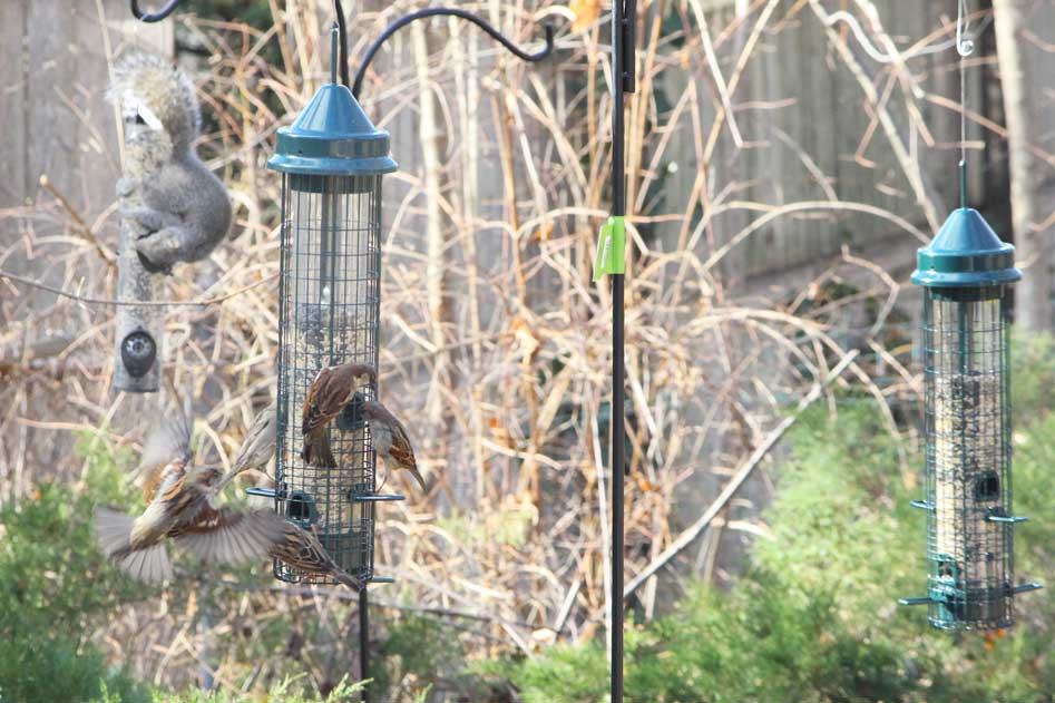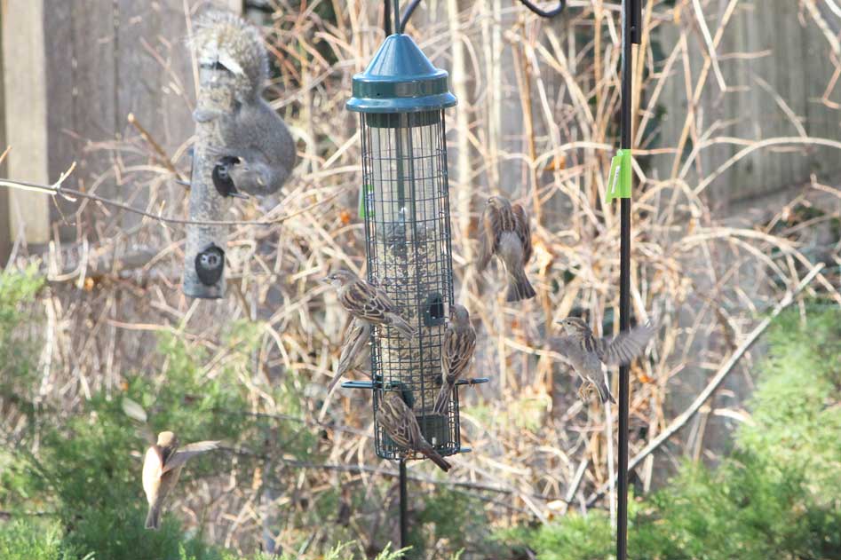 Hordes of house sparrows, while, in the background, a squirrel is able to extract seeds from an old plastic feeder.