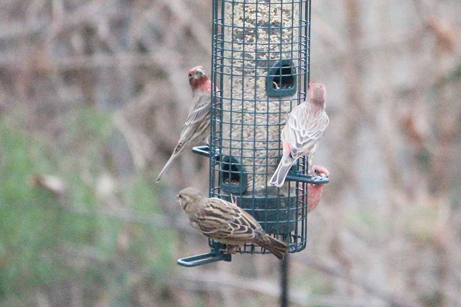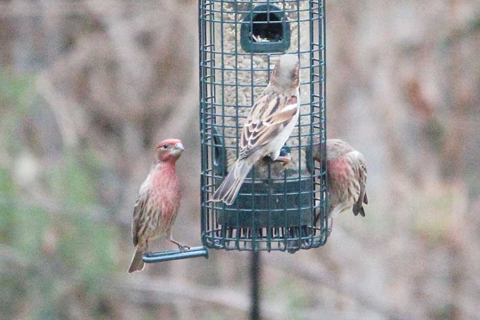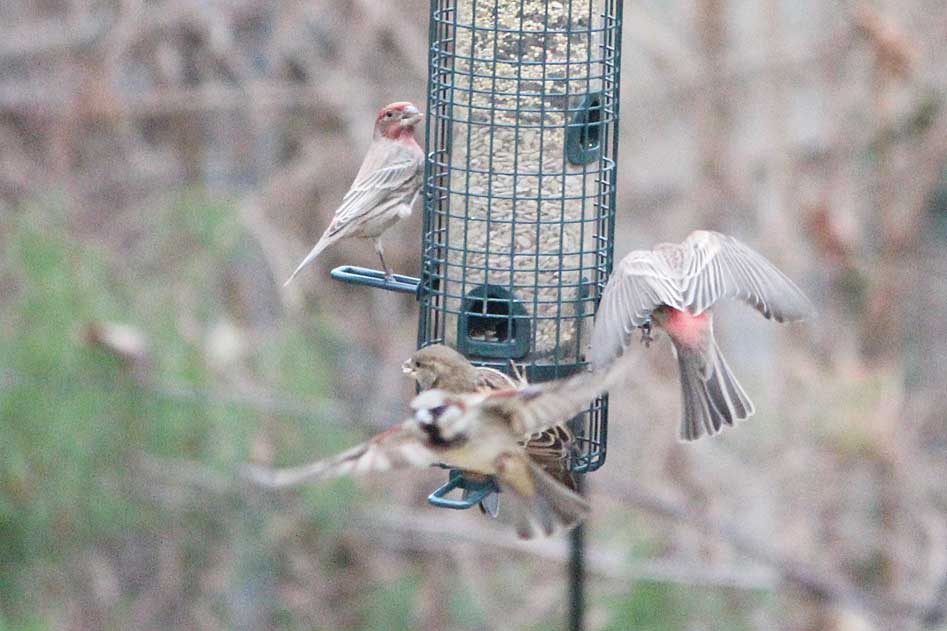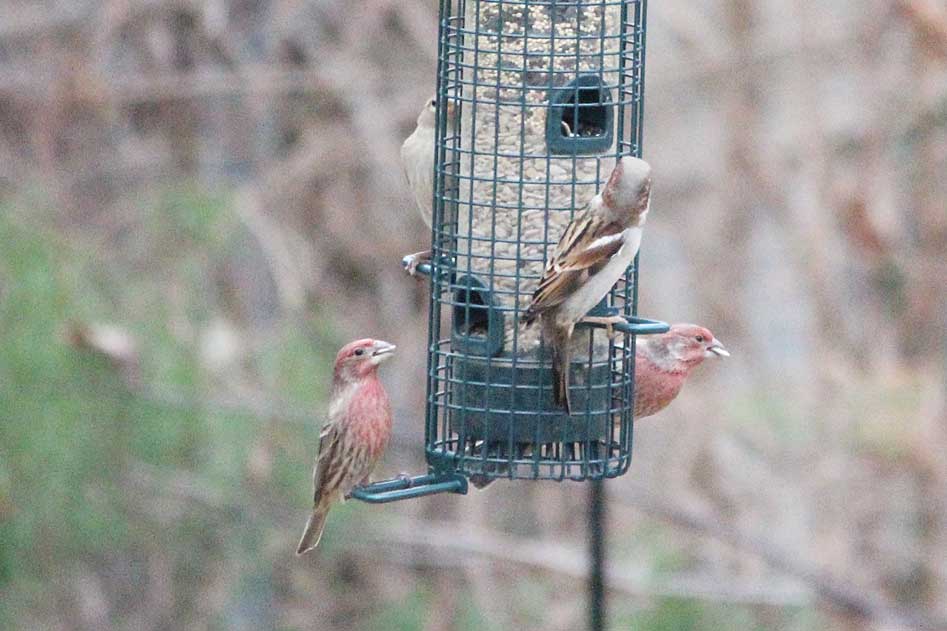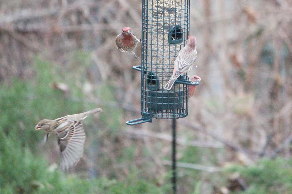 Three male house finches and just one house sparrow.