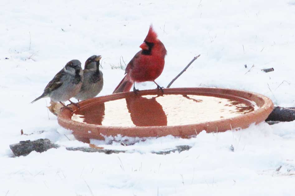 Three female cardinals; one white-throated sparrow; one house sparrow taking a bath