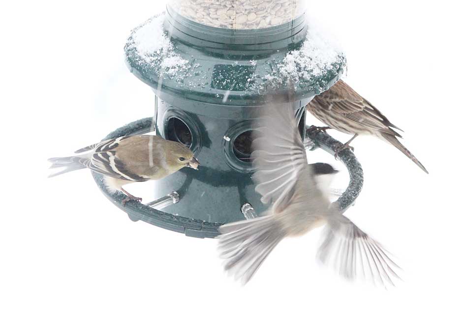 A chunk of suet was pushed into the deep snow on top of the baffle. Finally, every suet-loving bird could access it.