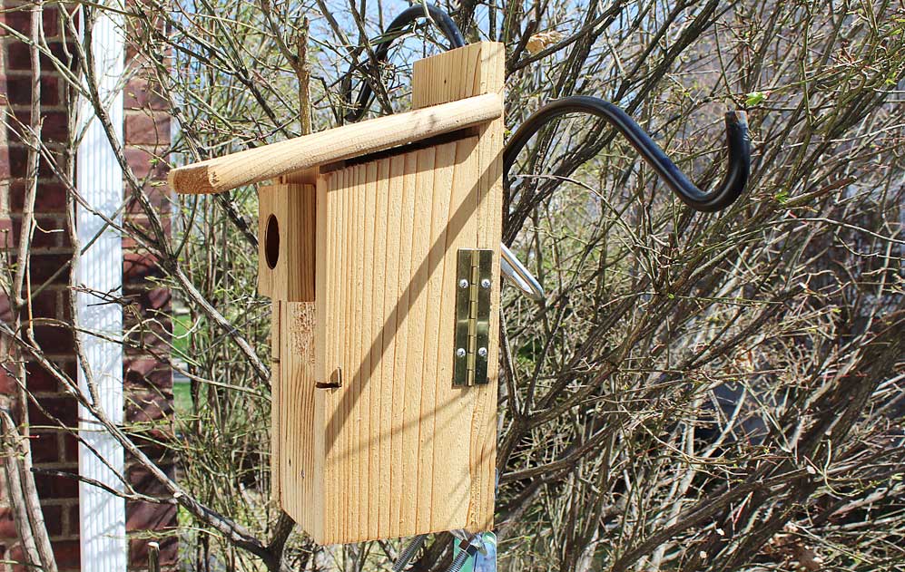 Two days later, 26 April: I tapped gently on the nesting box, and after a pause, a black-capped chickadee flew out. The husband