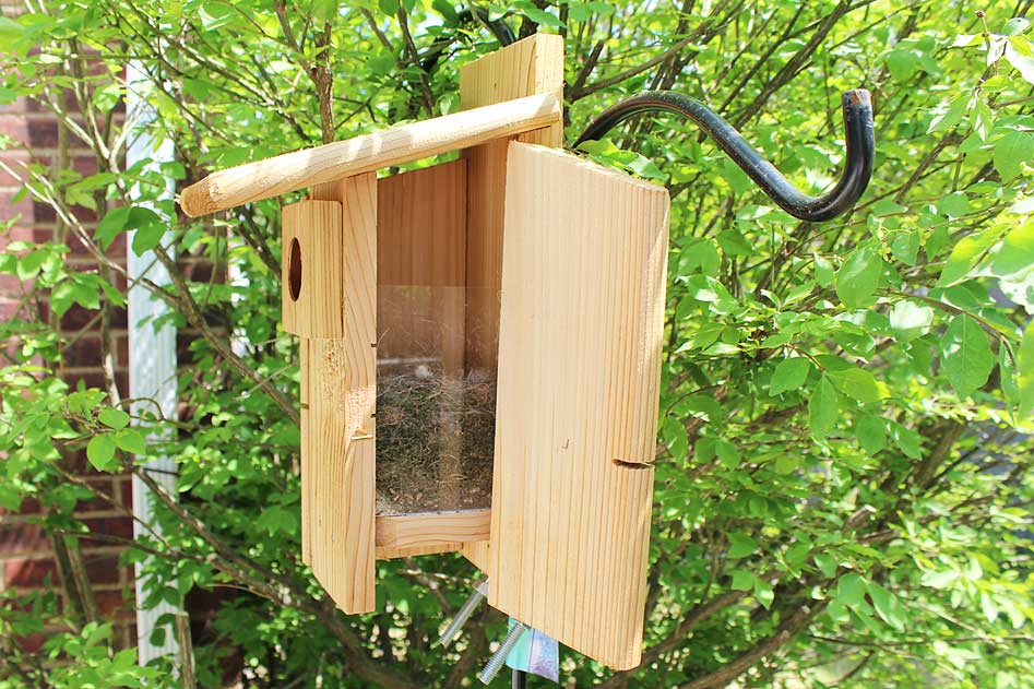 Around 2 p.m., after tapping on the outside of the nest box, the photographer opens the side door to see what's inside.