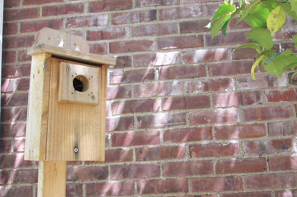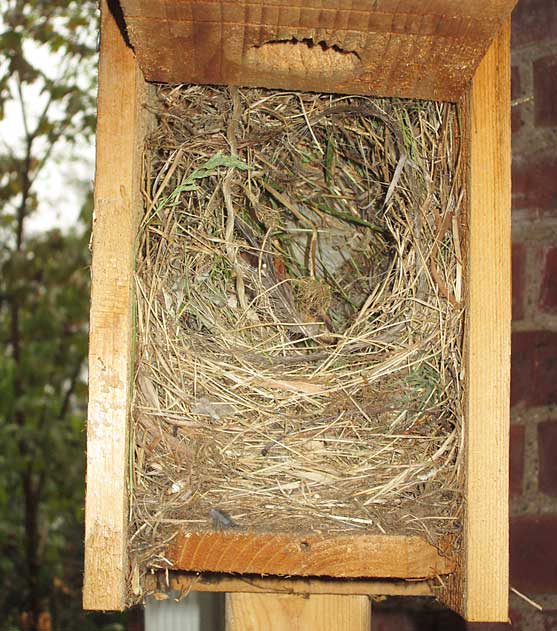 Having kicked out the little downy woodpecker that used to sleep here every night, a house sparrow family was begun in this next box next to our garage.