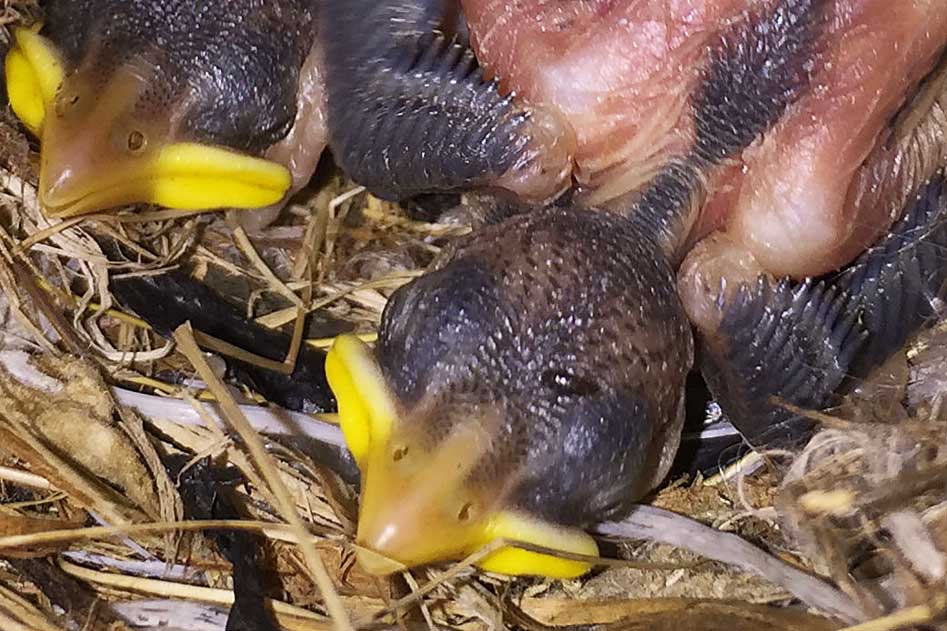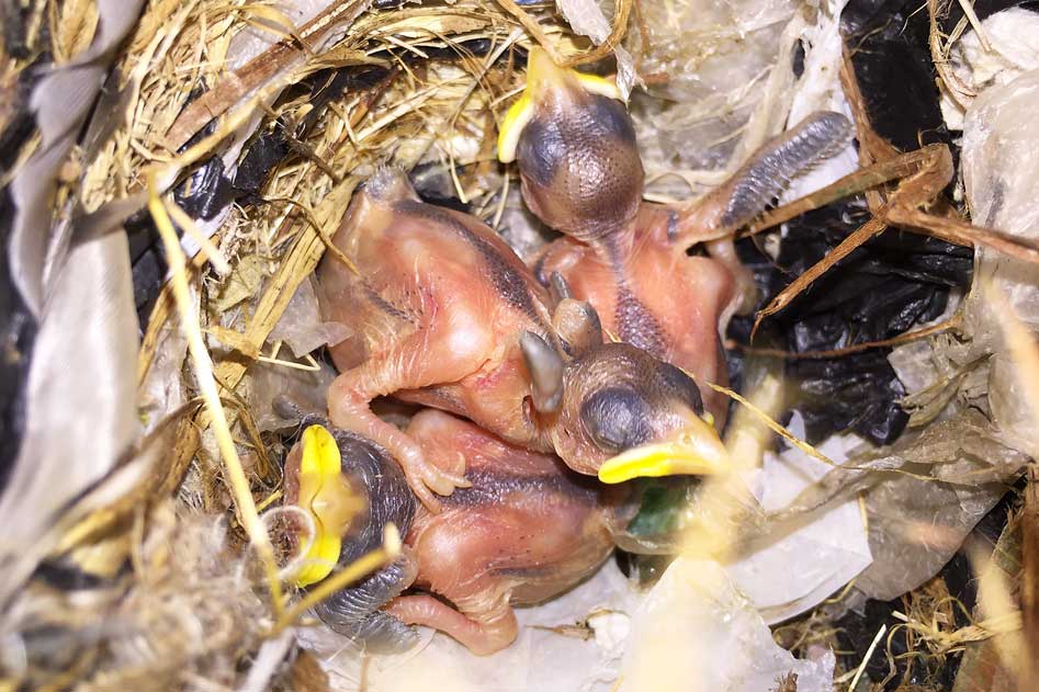 2 May 2017: The fourth egg hatched, a day or two after the others. The fourth little one is noticeably smaller.