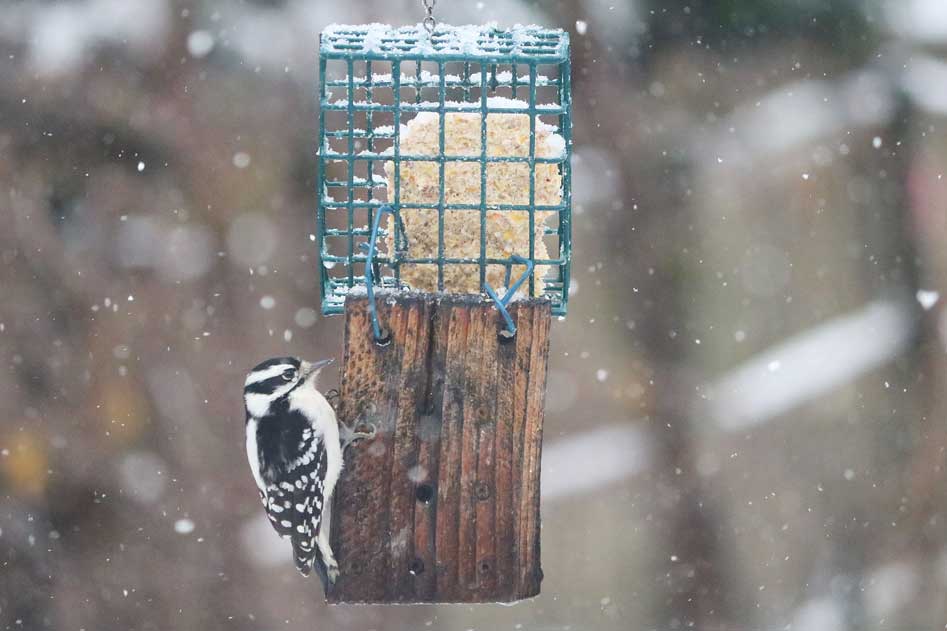 A female downy woodpecker waits patiently while the invaders attack the suet.
