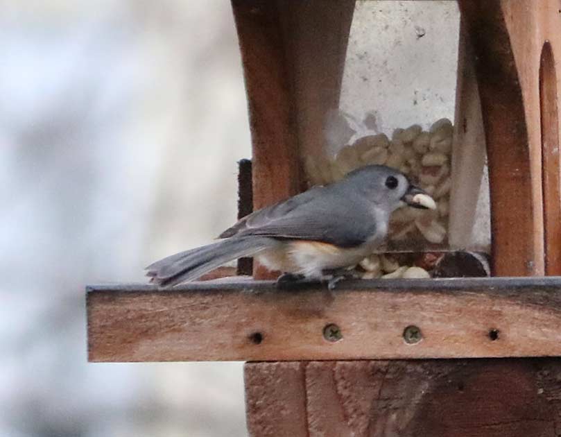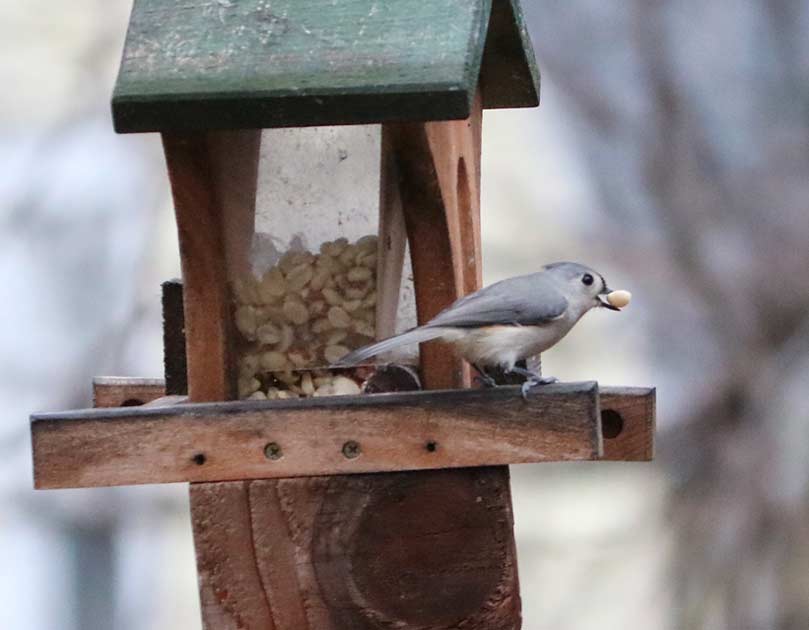 Two or three titmice will visit the yard at a time, grab a peanut, fly off, and then return a few minutes later.