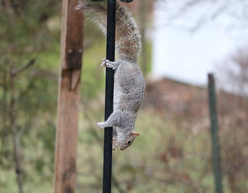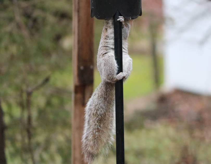 The shelled peanuts are at the top of a tall pole with a long baffle. That doesn't stop a squirrel from trying to get past the baffle.