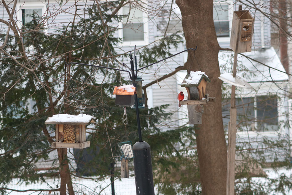 Photos: Feeders are hung from a tall pole (you have to stand on a stepladder to reach the feeders), which also has a baffle. Squirrels are very determined — year after year a squirrel climbs up the pole, into the baffle, then turns around and climbs down again.