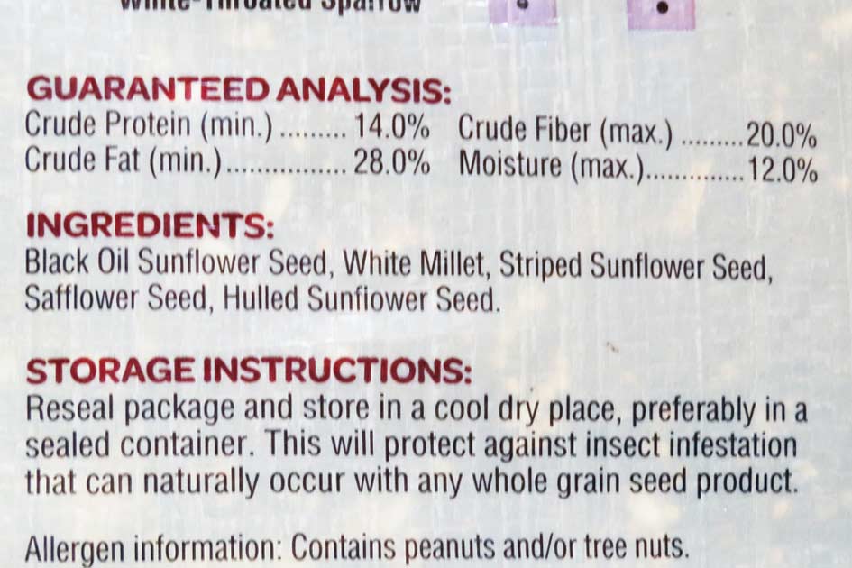 40 lb (18 kg) bags of mixed birdseed from Costco, which lists what seeds are in the bag — all seeds that wild birds like. There are no "junk" seeds, unlike the discount bags found in grocery stores, which contain things birds don't eat. Many cheap mixes don't list the ingredients by name.